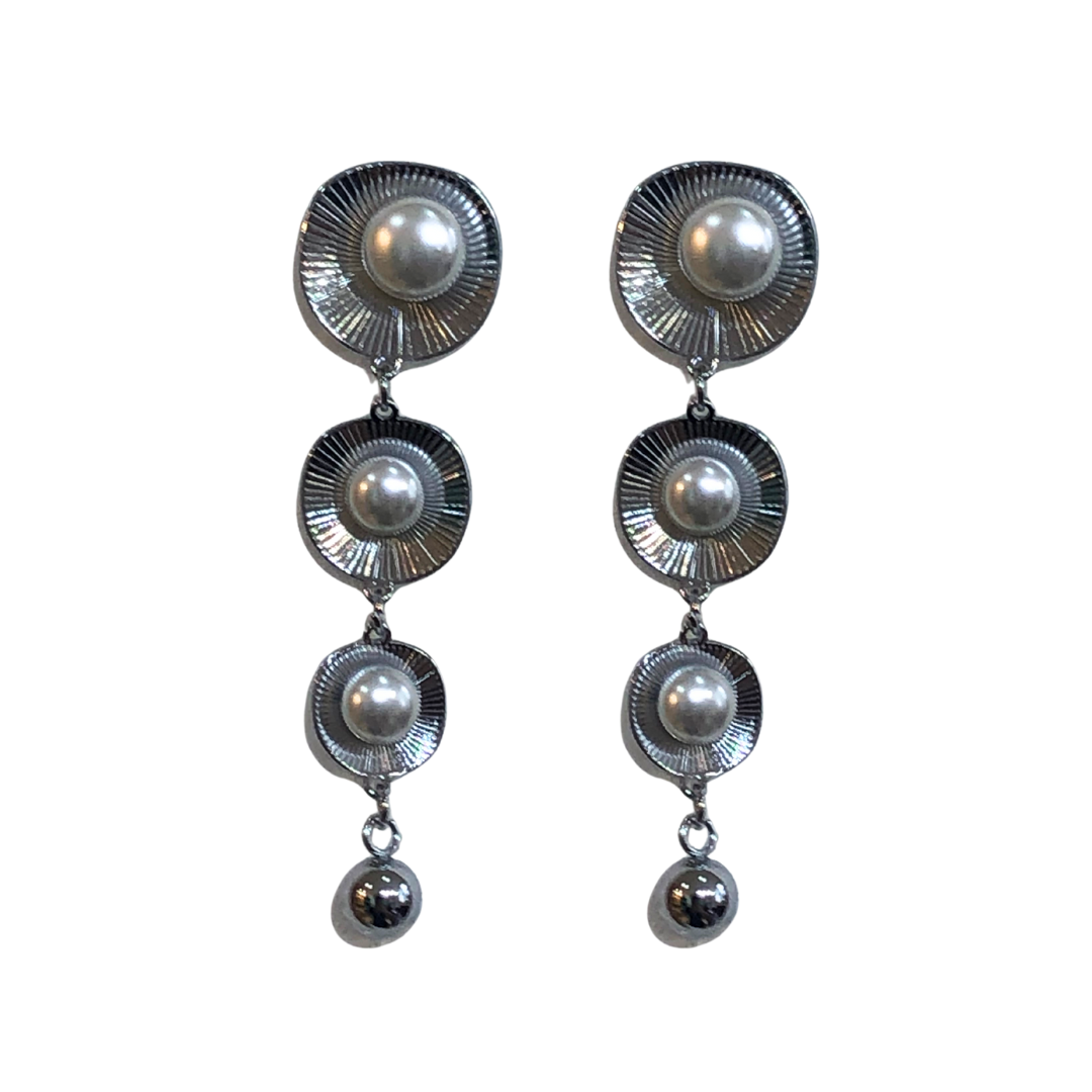 Brinco prata de esferas orgânicas em aço com pérolas da marca Daniela Curvelo. Um acessório sofisticado que une modernidade e delicadeza, ideal para mulheres que buscam elegância em qualquer ocasião.