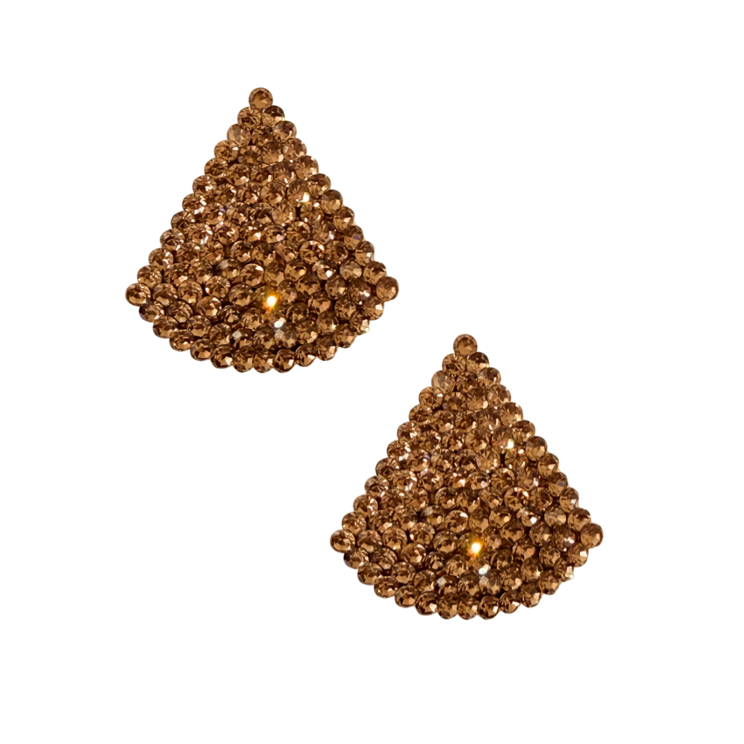 Brinco grande triangular com strass dourado, feito à mão na loja Daniela Curvelo. Um acessório artesanal, exclusivo e cheio de personalidade, desenvolvido para quem busca um brinco marcante, moderno e elegante. O banho dourado combinado ao brilho do strass cria um visual sofisticado e iluminado, perfeito para valorizar produções do dia a dia a eventos especiais.