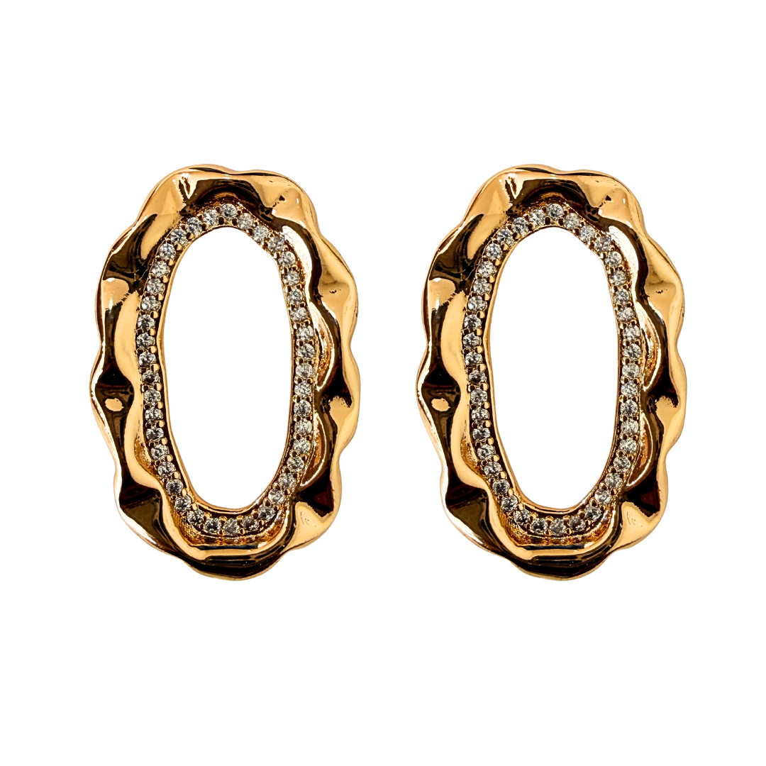 Brinco médio dourado em formato oval com acabamento texturizado e aplicação de zircônias, perfeito para quem busca um acessório feminino sofisticado e atual. O design elegante aliado ao brilho das zircônias valoriza o rosto e traz um toque de luxo na medida certa. Uma peça versátil que transita facilmente do dia à noite, elevando qualquer produção.