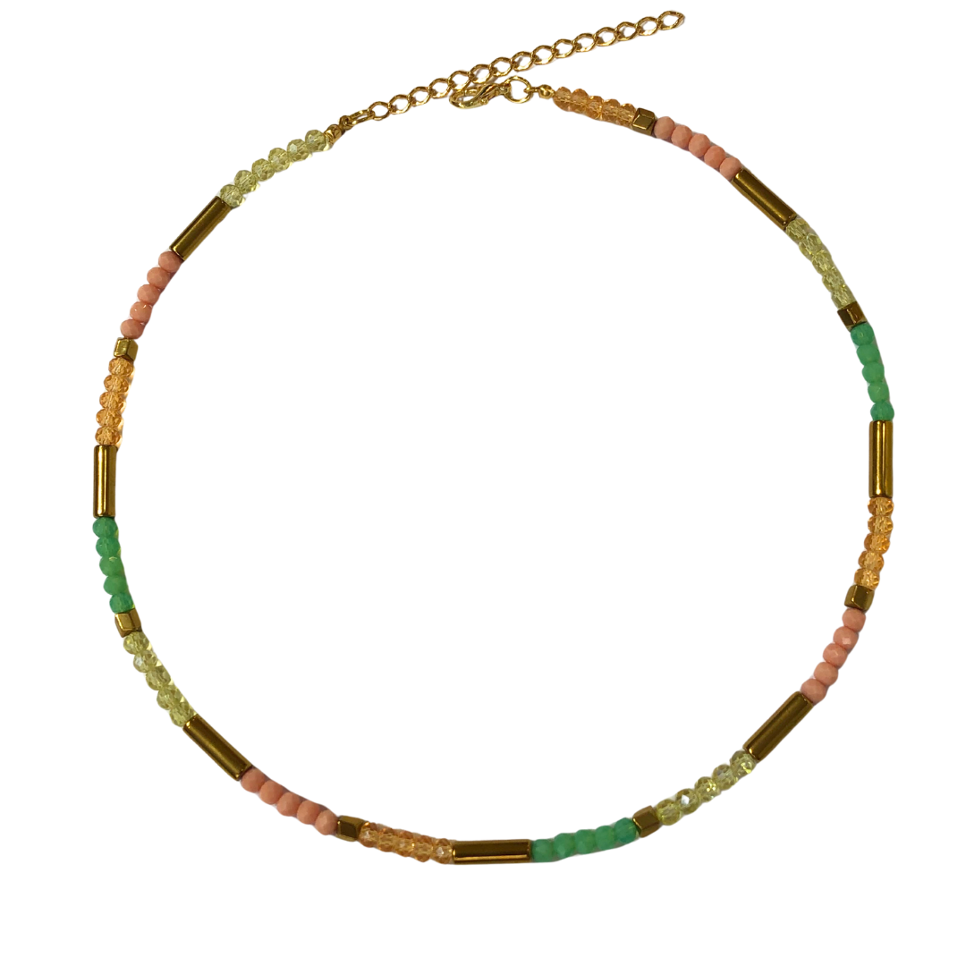 A Choker de Cristais Candy com Hematita Dourada CL756 da marca Daniela Curvelo é uma peça artesanal feita à mão e exclusiva, perfeita para adicionar cor e sofisticação ao look. Produzido com cristais em tons laranja candy, rosa claro opal, amarelo manteiga, verde claro opal e hematita dourada, combina delicadeza e estilo em um acessório moderno.