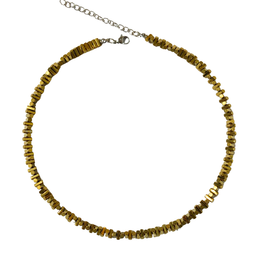 Choker artesanal feito à mão com hematitas douradas em formato de palitinhos, exclusivo da marca Daniela Curvelo. Peça elegante e versátil, perfeita para valorizar qualquer look com sofisticação e estilo único.
