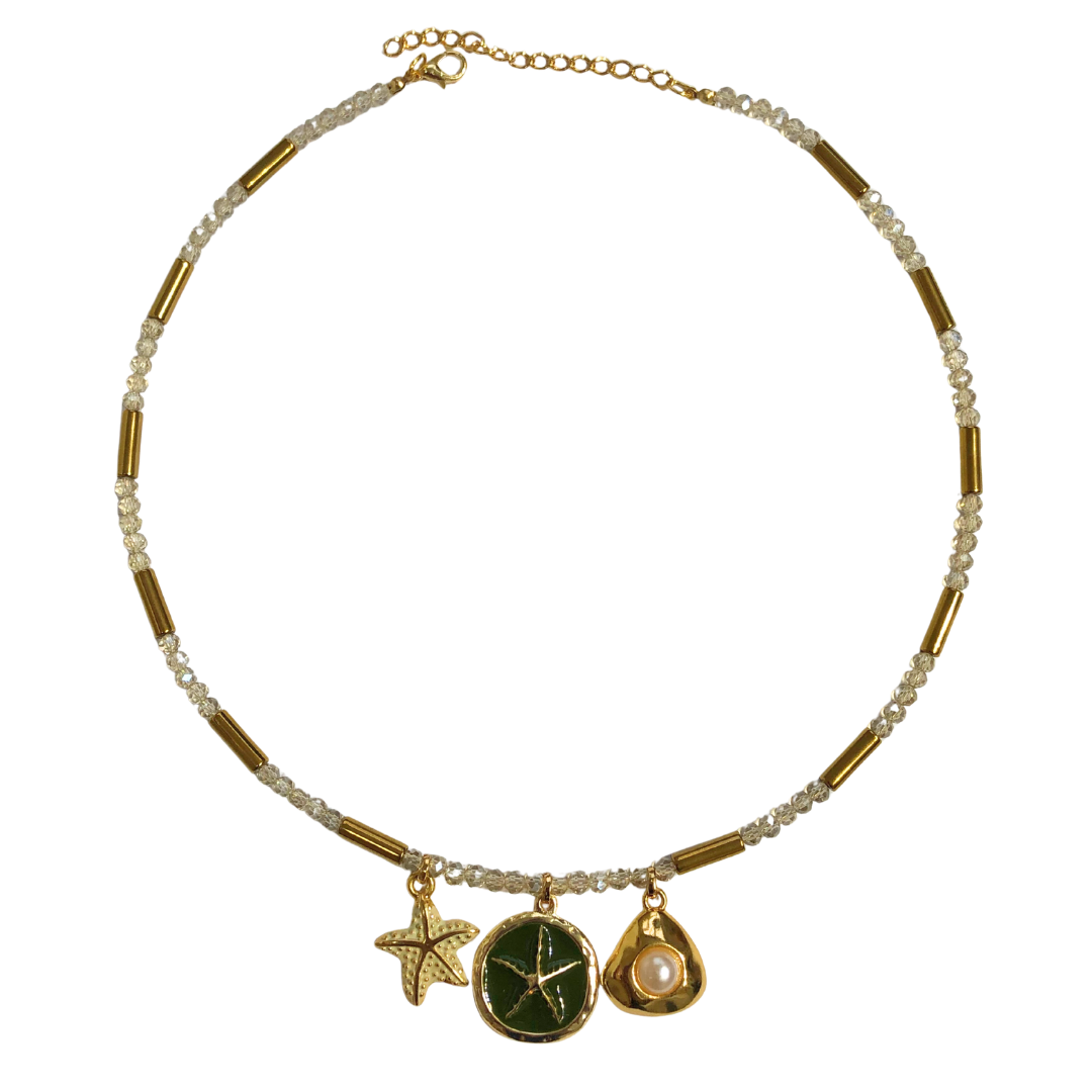 Colar de Cristais Champanhe com Hematita Dourada e Pingentes CL752