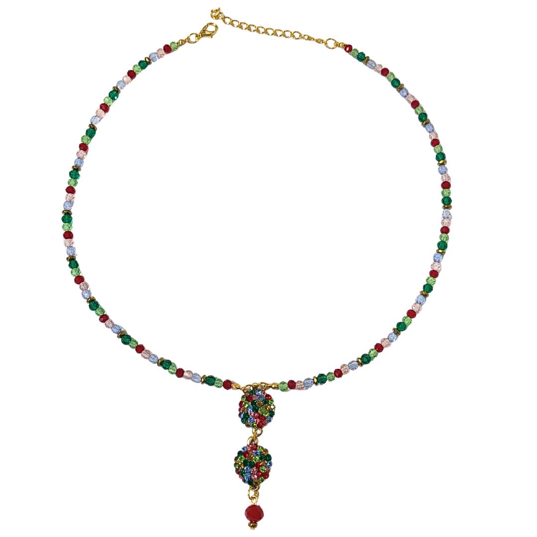 Colar artesanal feito à mão na Loja Daniela Curvelo. Exclusivo e delicado, combina cristais coloridos em tons vibrantes como verde esmeralda, rosa claro, vermelho, azul jeans, verde claro e amarelo candy, com pingentes de strass que adicionam brilho e sofisticação. Uma peça artesanal versátil e atemporal, perfeita para transformar qualquer look.