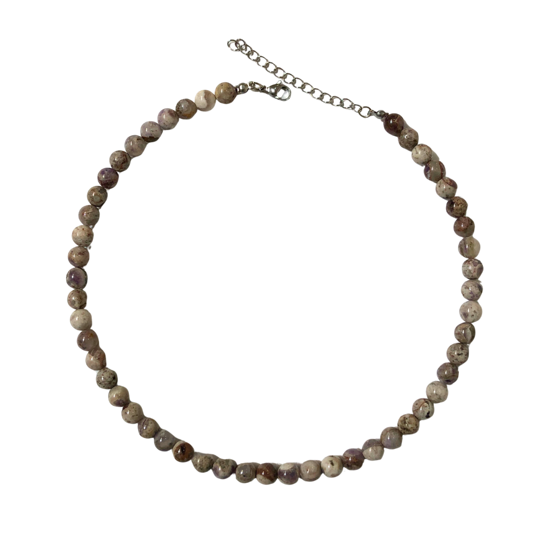 Colar exclusivo feito à mão com pedras naturais de Ametista Chevron, combinando tons de roxo, branco e cinza. Peça artesanal da marca Daniela Curvelo, perfeita para mulheres que buscam sofisticação, energia positiva e estilo único.