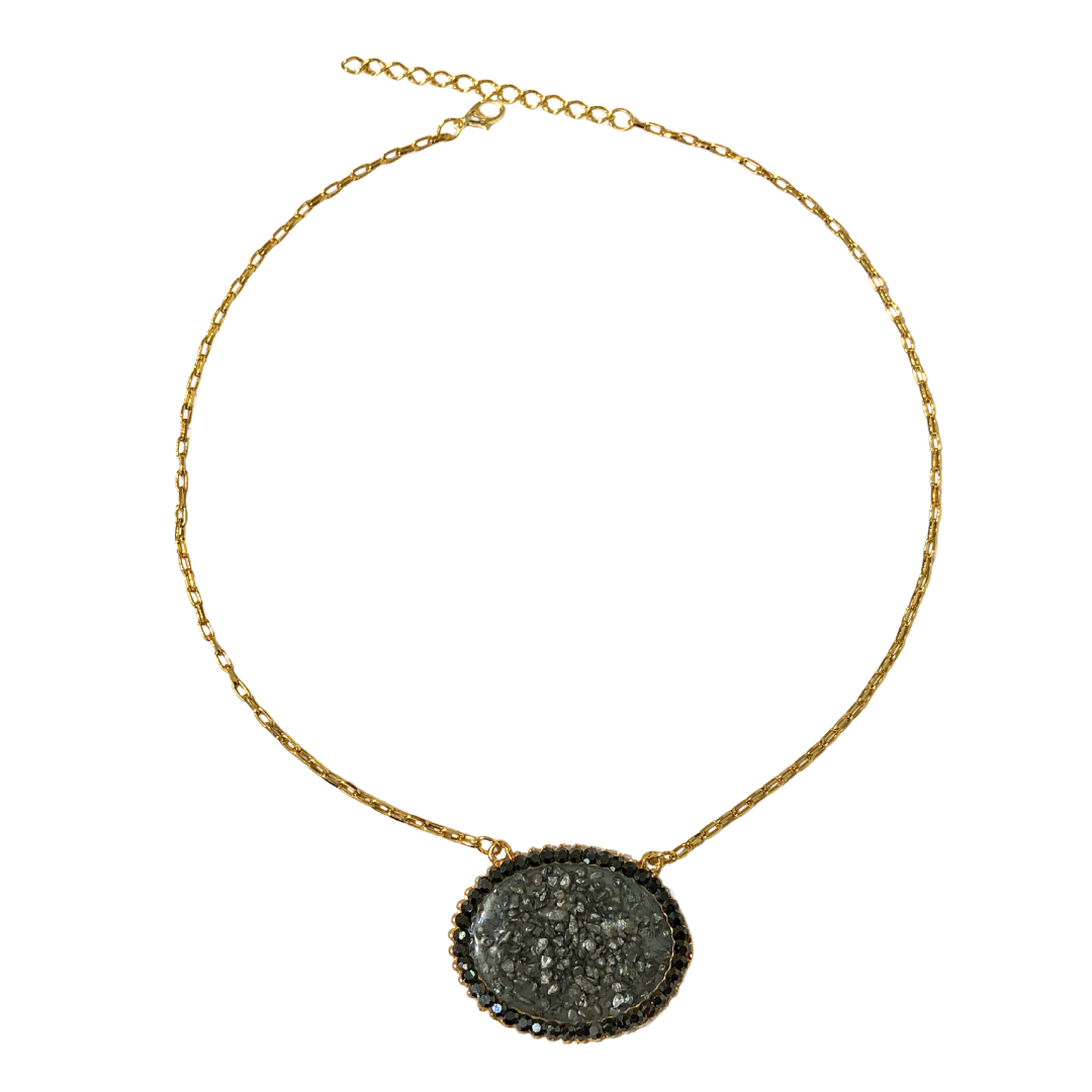 Colar artesanal com pingente oval esmaltado e resinado, produzido manualmente peça por peça, garantindo exclusividade e variações únicas no acabamento. O cascalho aplicado dentro da resina cria textura, profundidade e um visual sofisticado, tornando cada colar totalmente único.