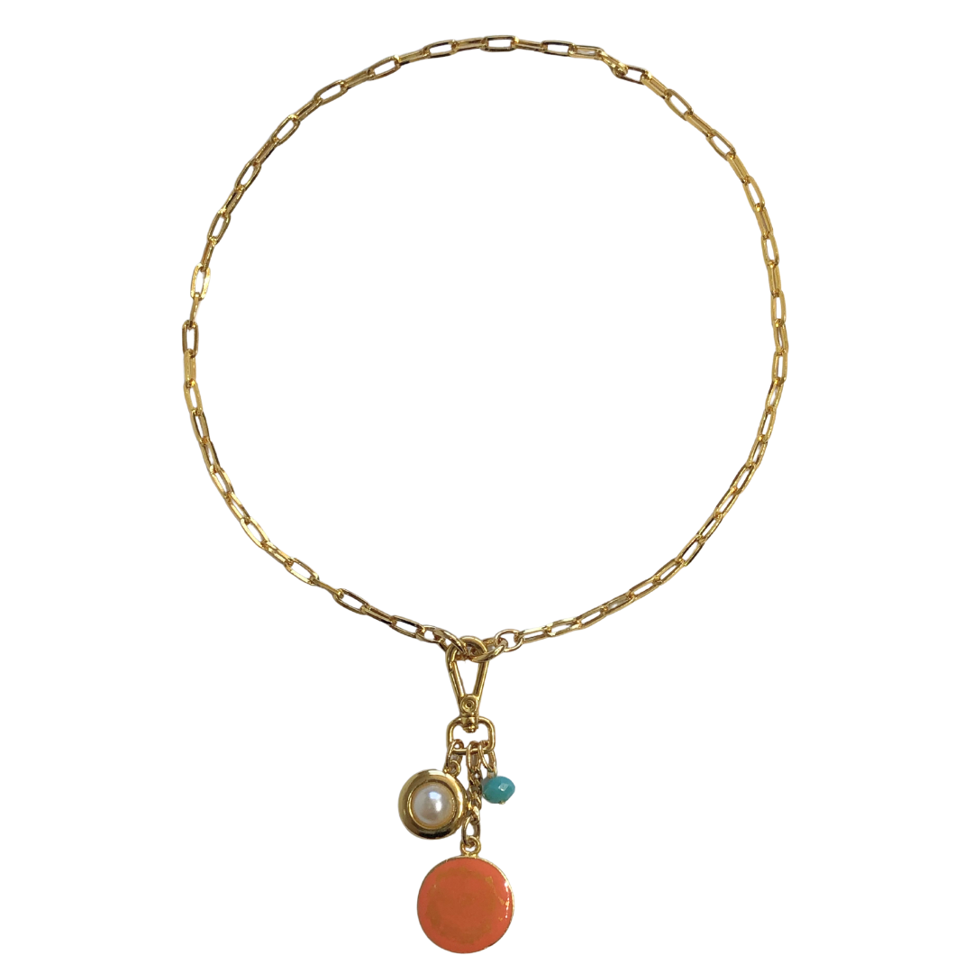 Colar artesanal exclusivo, produzido com corrente dourada e pingente resinado e esmaltado em laranja com detalhes dourados, além de pérola e cristal que trazem brilho e elegância. Uma peça marcante, moderna e cheia de personalidade para iluminar qualquer look.