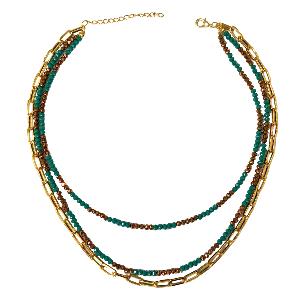 Colar Triplo de Cristais Verde-água Escuro e Cobre com Corrente Dourada CL765 – Daniela Curvelo