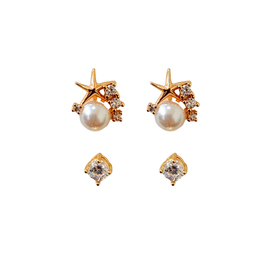 Kit Segundo Furo Brincos Dourados Estrela com Zircônias, Pérola e Ponto de Luz BF1360
