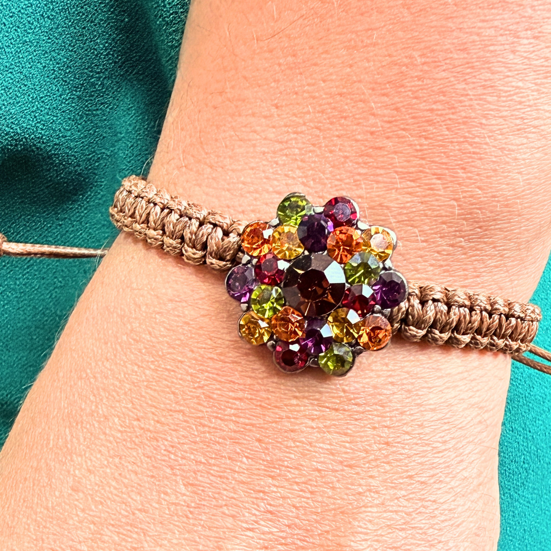 Pulseira Ajustável de Macramê Marrom com Pingente Flor Colorida 857P – Daniela Curvelo