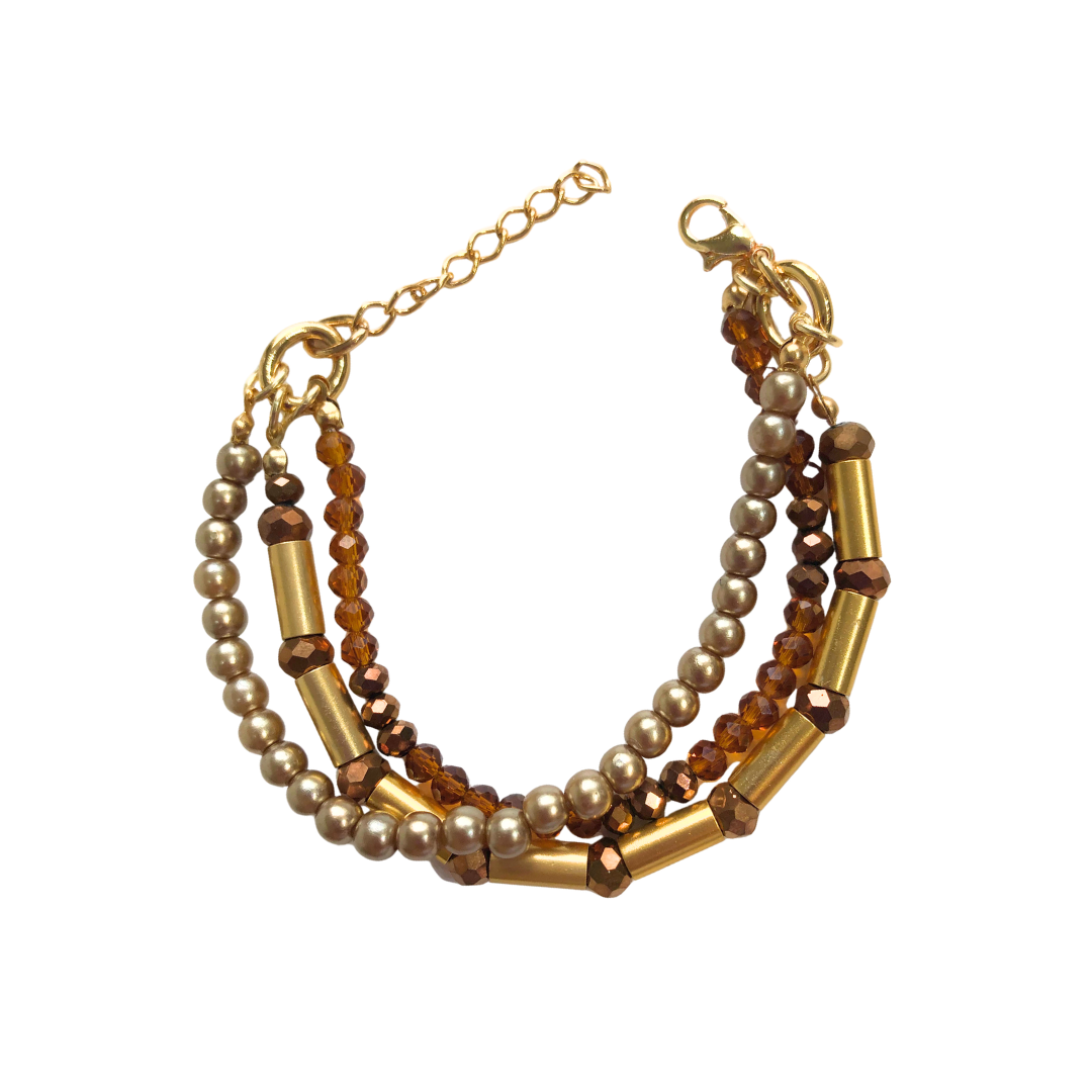 Pulseira de 3 Voltas de Cristais Caramelo e Cobre, Canutilhos Dourados e Pérolas 843P
