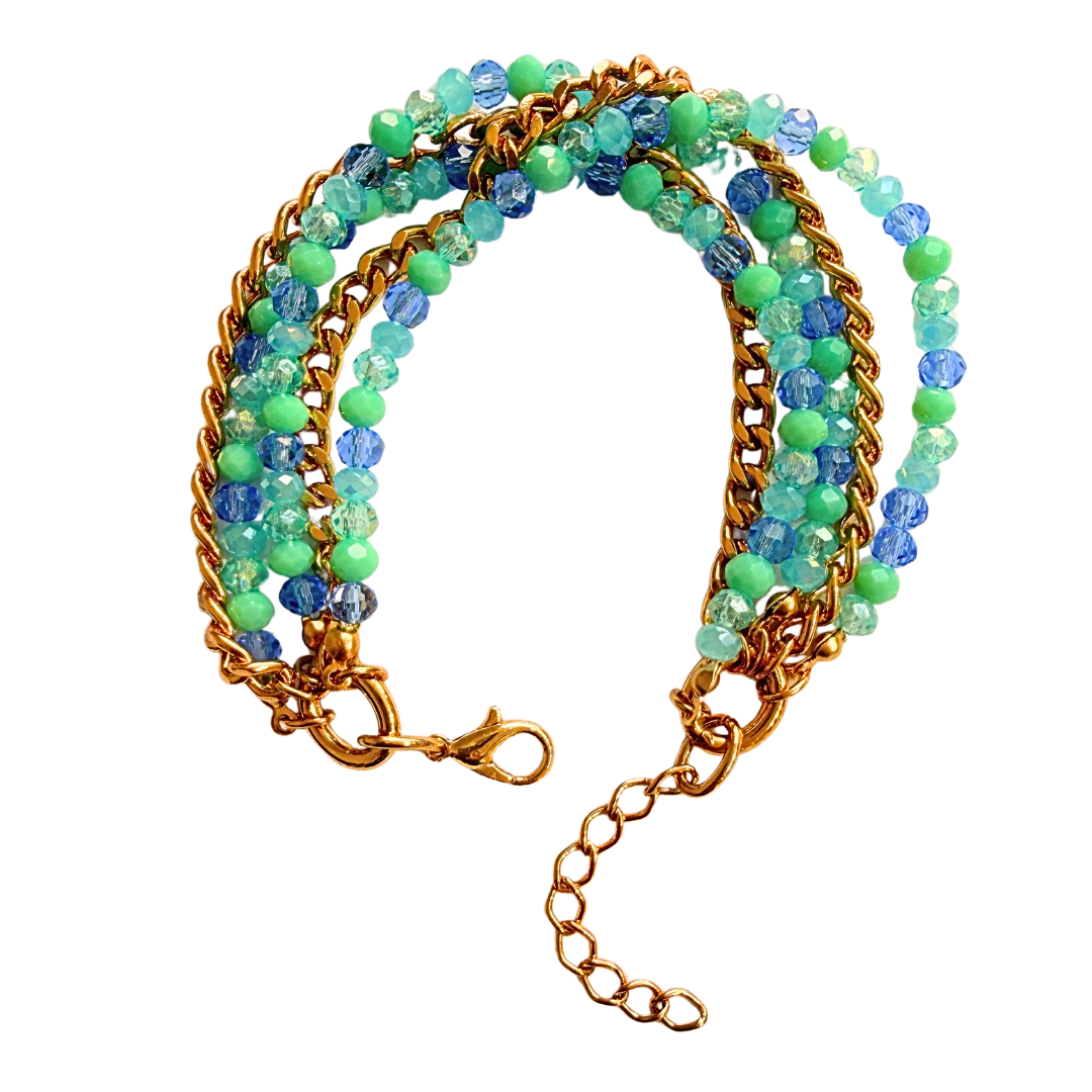 Pulseira de 5 Voltas de Cristais Azul e Verde Água Dourada 848P