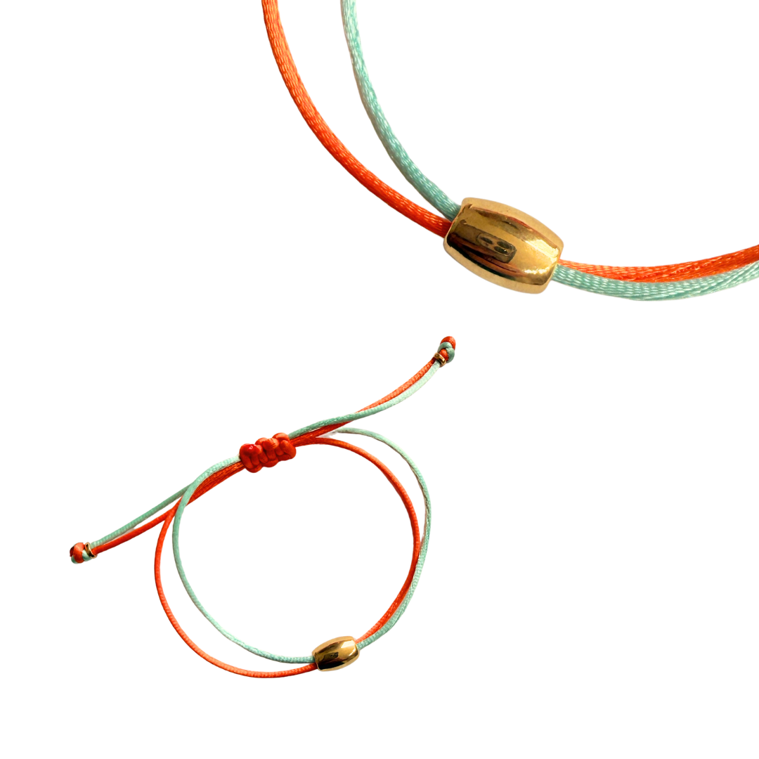 Pulseira Regulável Fio de Seda Laranja e Azul Claro com Pingente Oval Dourado 832P - Daniela Curvelo