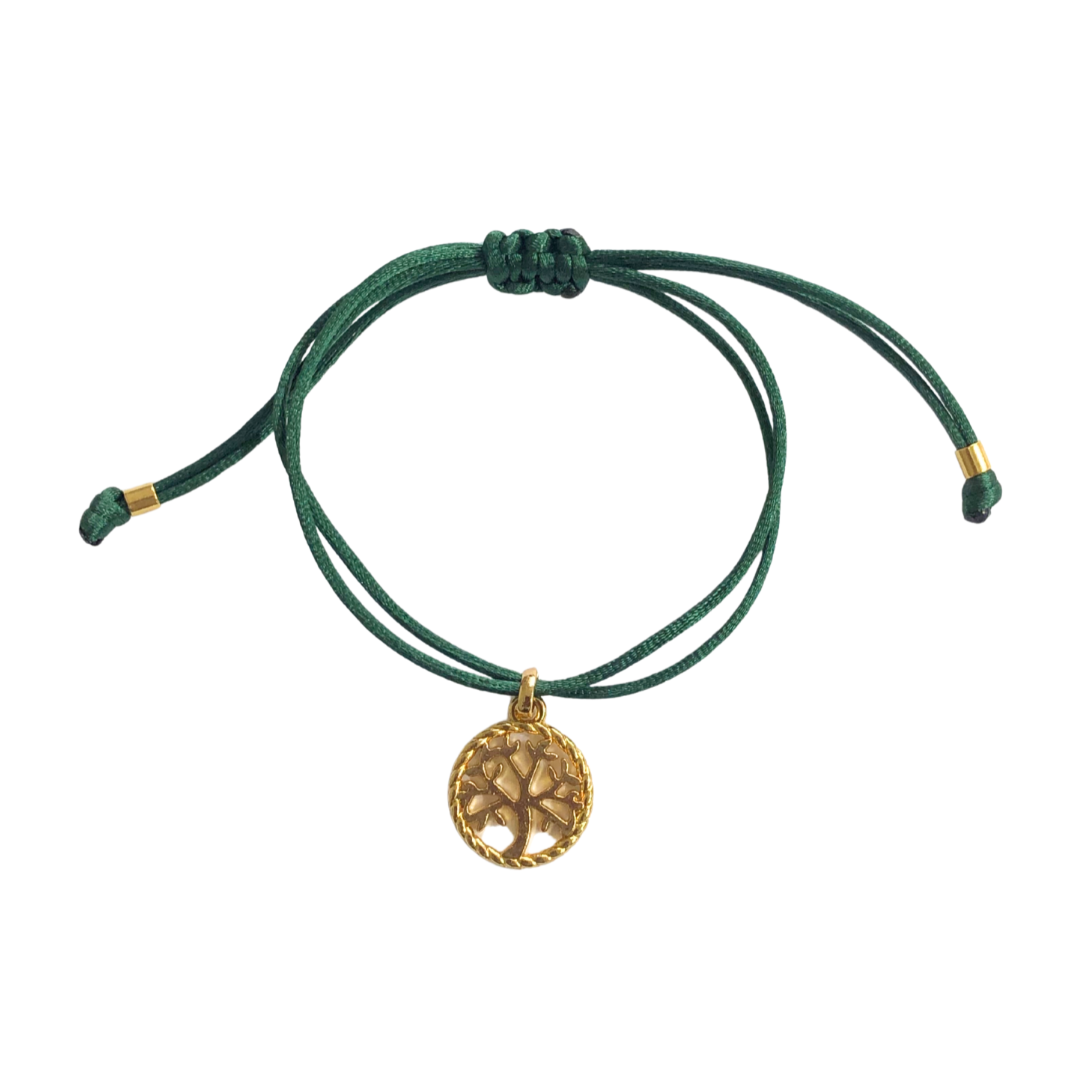 Pulseira feminina regulável confeccionada em fio de seda verde esmeralda, com pingente Árvore da Vida em metal dourado. Peça artesanal feita à mão na loja Daniela Curvelo, que simboliza força, equilíbrio e conexão. O tom verde esmeralda traz sofisticação e significado, enquanto o dourado valoriza o acabamento, tornando a pulseira ideal para uso diário ou para composições em mix.